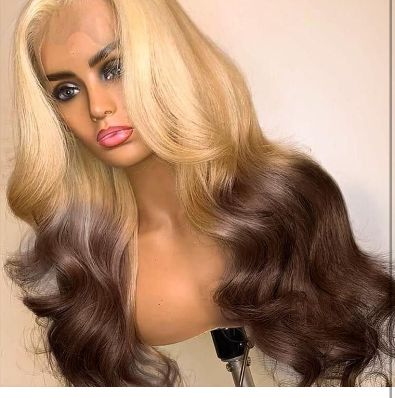 Esta peluca es un verdadero espectáculo de color y estilo. 🌟 Con una base en un elegante rubio platinado que se funde en un café chocolate oscuro hacia las puntas, ofrece un efecto ombré sofisticado y moderno. Sus ondas suaves y voluminosas aportan un toque glamuroso, perfecto para quienes buscan un look impactante y versátil.